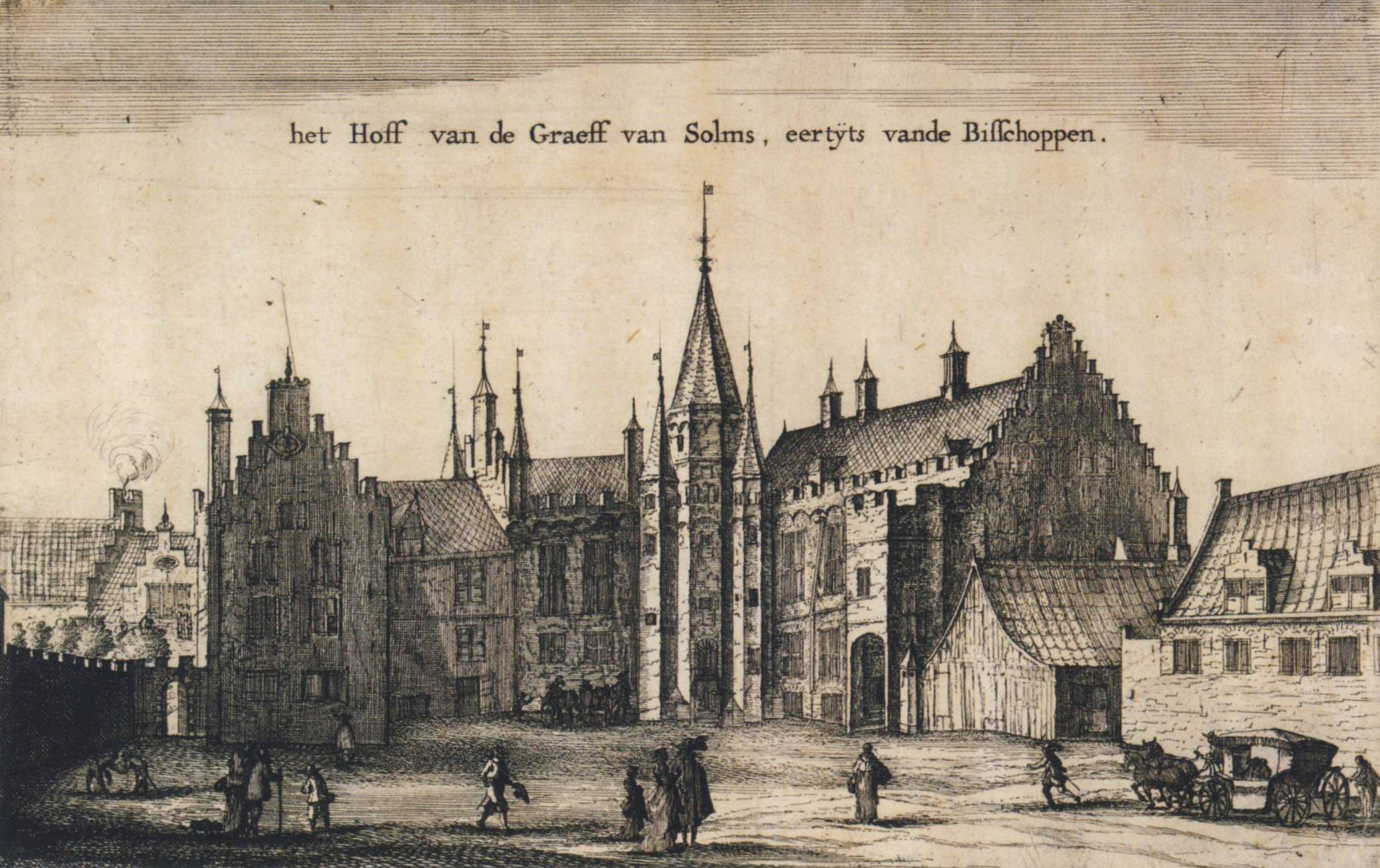 Een van deze muren, waarschijnlijk eerstgenoemde, zal deel hebben uitgemaakt van het gebouw met de bisschoppelijke zaal. Wellicht dat nader onderzoek van de opgravingsgegevens hierover nog eens duidelijkheid kan verschaffen. Het is denkbaar dat deze zaal zich heeft uitgestrekt vanaf de domtoren met de Sint-Michielskapel in het oosten tot aan de burchtmuur in het westen, een lengte van meer dan dertig meter. In 1297 wordt gesproken van het recht dat Arnoud Millinc en zijn vrouw Heile hadden an der hofsteden ende an den craemsteden die gheleghen siin an des bisscops huus in der borch, van sunte Michiels capelle totter graft.[36] In 1360 is sprake van die craemsteden die neffen onsen gruuthuse t’Utrecht gheleghen siin onder den wulfte, op die side daer onse poorte staet, also alse Vu(l)qwynus die betymmert heeft, mit den anderen hofsteden die daer op beiden siden buten denselven ghewulfte gheleghen siin.[37] Het is niet duidelijk wat met de wulfte of ghewulfte bedoeld is. Wellicht ging het hierbij om een overstek of galerij rond de poort. Het gruithuis bevond zich tegenover deze kraamsteden (thans Servetstraat 2-10).[38] Dit gruithuis werd op zijn beurt gesitueerd teneffen ons heren hof van Utrecht.[39] In 1418/19 was de bisschop bezig met een verbouwing, waarbij de muur waar de kraamsteden tegenaan stonden, of althans een deel ervan, werd afgebroken.[40] De toenmalige bezitter van de kraamsteden en hofsteden, Lambert van Zuilen, zou toen de perceelsgrens hebben overschreden. Hij beloofde dat hi an ons heren muer mit sine tymmeringe van sinen kraemsteden op sinen hofsteden bliven sel als hi was eer onse heer die muer brack.[41] In 1443 werd er nog door bisschop Rudolf van Diepholt schadevergoeding betaald vanwege het feit dat zijn voorganger deels cameren de voer an onsen hove bynnen Utrecht te beyden zeyden der poerten stonden ofbreken ende nederleggen deden buten wille ende consent Lamberts van Zuylen.[42] Het is de vraag of er in 1418/19 weer een nieuwe zaal precies ter plaatse van de oude is gebouwd. Weliswaar werd hier nog in 1569/71 de aartsbisschoppelijke zaal vermeld,[43] maar op de plattegrond van Braun en Hogenberg is deze zaal niet meer aanwezig (zie de afbeelding hierboven). Ook op de afbeelding van de domkerk van S. van Lamsweerde uit 1660 (zie hieronder) komt deze zaal niet voor. Daarop staat de nog steeds bestaande poort en het huis naast de domtoren dat in de literatuur abusievelijk de spinde wordt genoemd. Wellicht is dit laatste gebouw eerst opgetrokken in 1418/19. Verder is het mogelijk dat er toen een nieuwe bisschoppelijke zaal gebouwd is die zich minder ver naar het oosten uitstrekte, waardoor de poort niet meer overbouwd was. Op de diverse bouw- en verbouwingscampagnes zal ik later terugkomen. |