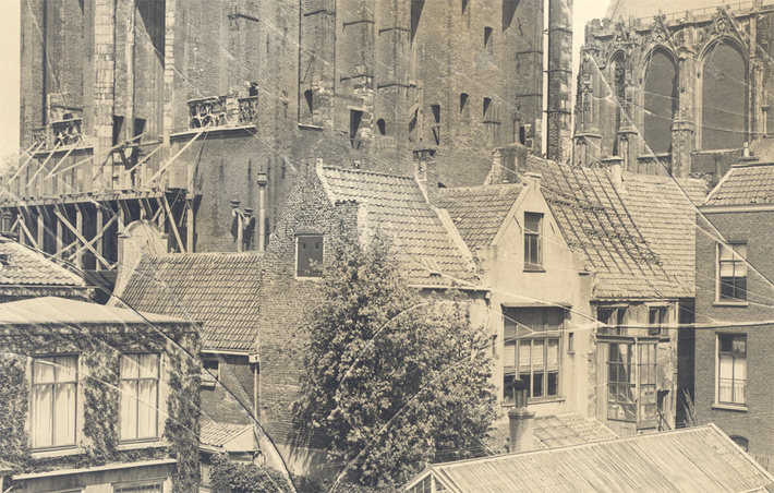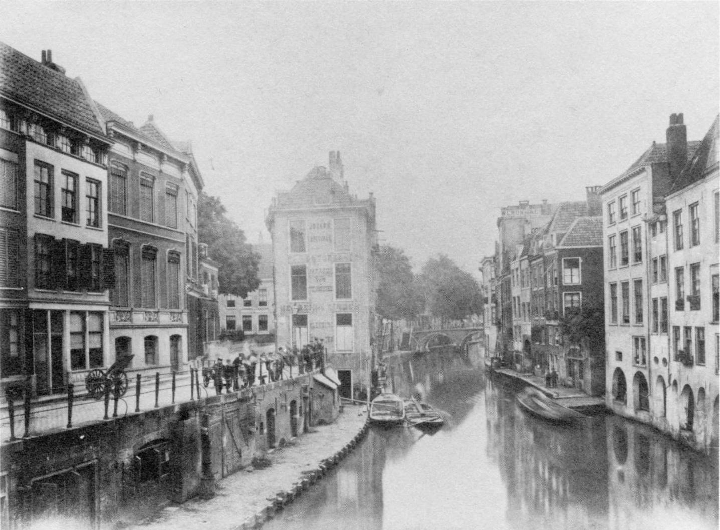 Zoals we nog zullen zien betrof dit het gebied van de huidige Donkere Gaard. Met de andere gracht zal de middeleeuwse zuidelijke burchtgracht bedoeld zijn. Ik kom daar nog uitvoerig op terug. Hier gaat het om de vermelding van de bontwerkerskameren aan het eind van bisschoppelijke keuken, die gesitueerd moet worden bij het begin van de Donkere Gaard, waarschijnlijk ter hoogte van Lichte Gaard 9. De op deze plek teruggevonden resten zouden dan deel hebben uitgemaakt van deze keuken. De kameren worden ook genoemd in een oorkonde van 20 maart 1298, waarin de bisschop verklaart dat hij ten onrechte ruiminggeld had geheven van de huizen van Oudmunster tussen de bontwerkerskameren en de brug van de nieuwe gracht.[50] Ook daar kom ik op terug. Links de huizen van de Lichte Gaard, vervolgens de Donkere Gaard gezien vanaf de Maartensbrug. In oorsprong waren de huizen van de Lichte Gaard tegen de middeleeuwse burchtmuur aangebouwd. De bebouwing tussen straat en de gracht in de Donkere Gaard vindt, met uitzondering van het voorste huis, haar oorsprong in de schenking van de bisschop aan het kapittel van Oudmunster in 1238. Foto van G.L. Mulder uit 1878. Uit: De Bruijn en Van der Eerden, ‘Het Utrechtse burggraafschap’, 73. De Lichte Gaard Het lijkt erop dat de keuken zelf deel heeft uitgemaakt van het winterhuis. Zo werd het perceel van het tegenwoordige Donkere Gaard 1 in 1323 gesitueerd tegenover het winterhuis.[51] In 1287 beroofden en verwondden een aantal bontwerkers en hun gezellen een knecht van een gevolmachtigde van de pauselijke legaat, met zijn gevolg. Dit gebeurde tussen de brug en het winterhuis.[52] Met de brug is hoogstwaarschijnlijk de Borchbrug (Sint-Maartensbrug) bedoeld, zodat het voorval zal hebben plaatsgehad aan het begin van de Lichte Gaard. De huizen aan de Lichte Gaard werden in 1366 gesitueerd onder de Riemsnider an des bisscops winterhuys.[53] De straat Under de Riemsnider werd al vermeld in 1310 voor het perceel Donkere Gaard 3[54] en is waarschijnlijk identiek met Under de Ledersnider, al vermeld in 1247.[55] Het winterhuis zelf vinden we op deze plaats verder ook vermeld in oorkonden vanaf 20 december 1352. Op die datum is sprake van een eenre hofstede gheleghen bi den winterhuse, daer Andries de cuper op te wonen placht,[56] op 9 januari 1360 van de hofstede die gheleghen is alre naest den winterhuze, daer Gherijd de Cuper Andries sone nu op woent[57] en op 26 juni 1369 van de hofstede gheleghen bi den winterhuse, daer Andries de Cuper voertijds in te woenen plach ende daer nu ter tijd Ghisebrecht Stekelinc in woent.[58] Het gaat dus om hetzelfde erf, maar de precieze ligging is mij niet gebleken. Iets beter te situeren zijn de volgende percelen. Met het huidige Lichte Gaard 6 zal het perceel bedoeld zijn dat op 12 januari 1374 wordt omschreven als hofstede gheleghen in den Corten Gaerde, daer Gherborch Riems op te wonen plach, tusschen hofstede Nyclaes Jonghen an de overside ende tusschen hofstede Gheriid Everaets soens voerscreven an de nederside.[59] Uit dit erf werden jaarlijks veertig groten en twee hoenders betaald, die op de genoemde datum werden overgegeven aan Gerit Evertsz. den riemsnider, met wie vrijwel zeker de buurman van het noordelijke perceel bedoeld is (Lichte Gaard 5 dan). In 1416 kwamen de veertig groten en twee hoenderen per jaar aan de broederschap van het Heilig Sacrament in de Buurkerk.[60] Opmerkelijk is dat in deze oorkonden niet gesproken wordt van het winterhuis of Onder de Riemsnijders maar van de Korte Gaard. Ook in andere stukken komen we deze benaming tegen voor zowel de Lichte als de Donkere Gaard. Het huidige stuk Oudegracht vanaf het Wed tot aan de Gaardbrug werd de Lange Gaard genoemd, het geheel werd ook wel aangeduid als de Gaard kortweg. Nog beter gedocumenteerd is het zuidelijk aangrenzende perceel (waarschijnlijk Lichte Gaard 7), dat blijkens het bovengenoemde in 1374 in bezit was van Nyclaes Jonghen. Op 12 februari 1366 – ik heb de oorkonde al aangehaald – verschenen Maes Sollebolle ende Hase syn wyf voor de Utrechtse schepenen ende gaven mit samender hant Claes den Ionghen de husinghe ende hofstede, eggen ende eynden, boven ende beneden, bodem ende boort, mit sulken tinse ende pachte alse geleghen syn onder de Riemsniders an des bisscops winterhuys, daer Claes de Ionghe voerseyt nu in woont, tusschen der hofstede daer Iacob Scoute nu op woont an die overside ende tusschen der hofstede daer Dideric Scoute nu op woont an de nederside. Een oorkonde van 19 december 1368 spreekt van der husinge ende hofstede gelegen onder de Riemsnyders, tusschen der hofstede daer Iacob Scoute op woende an de overside ende tusschen der hofstede daer Dideric Scale op woonde an de nederside.[61] Hier is dus weer sprake van Onder de Riemsnijders. Dideric Scoute (bezitter van waarschijnlijk Lichte Gaard 6) wordt in de zojuist genoemde oorkonde aangeduid als Dideric Scale. We komen hem onder die naam tegen in een oorkonde van schout en schepenen van Utrecht van 16 juli 1381, waaruit blijkt dat hi hogher ende meer ghetymmert heeft dan hi mit recht doen mach an zire husinghe daer hi nu in woent, gheleghen in den Gaerde tusschen husinghe ende hofstede Gerborch Ysbrants ende Jacobs des voerscreven Dyderics soen aen die over side ende tusschen husinghe ende hofstede die Rutgheer Ludolfs soen in erfpachte heeft van Ysbrant Jacobs aen die nederside. Waarschijnlijk is Gerborg IJsbrandsdochter identiek met de hierboven genoemde Gherborch Riems. In de zojuist genoemde oorkonde beloofde Dirk Scale (of Scoute) voor zichzelf en zijn nakomelingen alse dat hi die voerseyde tymmeringhe (een woord onleesbaar, mogelijk: ofbreken) zel zo wanneer dat hi des van haren Florans, in deser tijd bisscop t’Utrecht, (ende) zinen nacomelinghe bisscoppen t’Utrecht of van hore (weghen) vermaent wert.[62] Bisschop Florens van Wevelinghoven waakte er dus over dat de huizen vóór zijn winterhuis niet te hoog werden opgetrokken. Over de bebouwing van dit winterhuis valt uit 