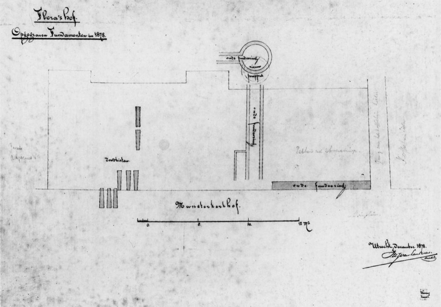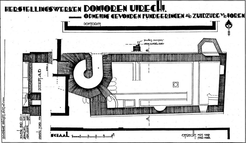 noordoostmuur van het bisschopshof Ongeveer op de plaats van de tegenwoordige westelijke rooilijn van het Domplein heeft zich een muur bevonden, die mogelijk de scheidsmuur vormde tussen het bisschopshof en een doorgang, die van het dwarsschip van de Oudmunsterkerk langs de Heilig-Kruiskapel in de richting van de domkerk liep. Deze muur is in 1878 aangetroffen bij de bouw van de huizen aan het Domkerkhof. Hij werd door de architect I.H.J. van Lunteren afgebeeld op een plattegrond.[25] Plattegrond met de oude fundering van de muur, gemaakt door I.H.J. van Lunteren in december 1878. Links (ongeveer zuid), waar teruggevonden sarcofagen zijn afgebeeld, stond de Oudmunsterkerk. De doorgang bevond zich op de plaats waar op deze plattegrond Munsterkerkhof en de maatstok staan afgebeeld. In zijn dissertatie maakt Jos Stöver hier een overdekte gang van,[26] maar het is de vraag of hiervan ooit sprake is geweest. Het is evenmin duidelijk of deze muur aan de kant van het bisschopshof, dus aan de westkant, bebouwing heeft gedragen. Op zich is het denkbaar dat deze muur behoorde tot het huis dat de apotheker Anselm en zijn vrouw Aleid in 1276 van de bisschop in gebruik kregen. Dit gebouw werd gesitueerd bij de Heilig-Kruiskapel en het zou dan precies tegenover de kapel hebben gestaan. Maar het is aannemelijker dat het bij dit huis ging om de onderverdieping van het zo dadelijk te behandelen iets noordelijker gelegen ‘huis’ van de bisschop. De noordoostelijke muur van het bisschopshof en zijn omgeving komen uitgebreid voor in een oorkonde van 24 mei 1540. Op de rugzijde staat met een zestiende-eeuwse hand: vonnis gewezen voor ons kapittel over de eigendom van de muur tussen – er staat eigenlijk: binnen – onze kerk en de Sint-Maartenstoren naar het westen toe.[27] Opmerkelijk en uitzonderlijk is dat dit vonnis over een onroerend goed binnen het kerkelijk immuniteitsgebied op verzoek van Oudmunster gewezen is door het schepengerecht van de stad Utrecht. Wellicht kon dit niet onpartijdig voor een kerkelijke rechtbank gebeuren, maar het is ook denkbaar dat het te maken had met de gewijzigde politieke omstandigheden. In 1528 had de bisschop immers zijn wereldlijke bevoegdheden moeten overdragen aan keizer Karel V. De
