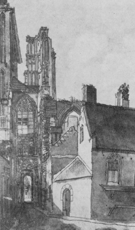 gemeentearchief is gemaakt. [25] HUA, Topografische Atlas [TA], 1a 3.2. Afgedrukt bij Stöver, De Salvator- of Oudmunsterkerk, 47, afb. 25. Het noordelijk deel van de gang op een tekening van Jan de Beijer uit 1745. Geheel links is nog een stukje van de muur te zien. Rechts de Heilig-Kruiskapel met voorbouw. [26] Ald. 52-54, 194. [27] Oudmunster 450: Sententia lata pro capitulo nostro de proprietate muri infra ecclesiam nostram et turrim sancti Martini versus occidentem (‘Vonnis gewezen voor ons kapittel over de eigendom van de muur tussen onze kerk en de Sint-Maartenskerk naar het westen toe’). |