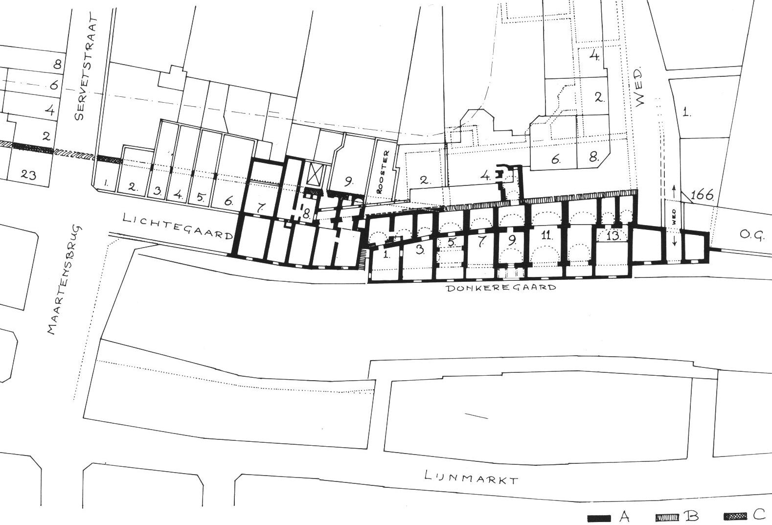 Donkere Gaard Zo weinig er te traceren is van de middeleeuwse bebouwing aan de Lichte Gaard, zo uitvoerig zijn we ingelicht over de ontwikkeling van de infrastructuur langs de Donkere Gaard. Dit is grotendeels te danken aan de omstandigheid dat het archief van het kapittel van Oudmunster goed is overgeleverd. De oudste rekening van het kapittel dateert van 1295. Behalve rekeningen zijn er ook geografisch geordende goederenregisters en cartularia – afschriften van oorkonden over bezittingen en rechten – bewaard gebleven. Van de oorkonden zijn er vele nog in origineel aanwezig. Zoals hierboven al is uiteengezet, zijn de bezittingen van Sint-Salvator of Oudmunster in deze omgeving terug te voeren op een oorkonde van 16 december 1238, waarin bisschop Otto van Holland een stuk grond van het bisschopshof aan het kapittel van Oudmunster schenkt voor het houden van zijn memorie en dat van zijn ouders en broers. De bisschop spreekt hierin van de ruimte buiten zijn boomgaard. Hieruit valt af te leiden dat er in de zuidwesthoek van het bisschoppelijk complex nog geen of althans weinig bebouwing aanwezig was. De aan Oudmunster geschonken grond zal hierna vrij snel verkaveld zijn. De huizen werden gebouwd aan de gracht of althans aan de werf, die later overbouwd werd, met een zeer smalle weg tussen de bebouwing en het bisschopshof door. Na een stadsbrand vijftien jaar later, in 1253, stond de bisschop het kapittel toe om de door brand verwoeste erven bij zijn boomgaard weer te bebouwen.[63] Waarschijnlijk zijn deze erven ook mee bedoeld in een bisschoppelijke oorkonde van 13 januari 1256. Hierin bepaalde de bisschop onder meer dat alle gebouwen aan de burchtgracht die langer en breder waren opgetrokken dan zij voor de brand waren, moesten worden afgebroken. Wie hiervan ‘ruiming’ wenste kon een beroep doen op de bisschop en de burggraaf.[64] Deze ruiming was het recht om wederrechtelijk opgetrokken bebouwing te laten verwijderen. Het bestond ook als een heffing op wederrechtelijke bebouwing, wanneer die ondanks dat gedoogd werd.[65] In 1298 hief de bisschop deze heffing rumingha van onder meer huizen ter plaatse geheten Op de Toren vanaf de kamers van de bontwerkers tot aan de brug van de Nieuwe Gracht (= Oudegracht). Hij erkende op 20 maart van dat jaar dat hij dit ten onrechte had gedaan[66] en verklaarde hierna de percelen in kwestie vrij van alle lasten. De benaming Op de Toren komen we vanaf de dertiende eeuw zowel in het Latijn als in het Middelnederlands tegen voor de Donkere Gaard.[67] Dat hiermee verwezen wordt naar de toren van de Oudmunsterkerk is niet erg aannemelijk; deze stond enkele tientallen meters verder naar het oosten toe. Het meest waarschijnlijk is dat de benaming verwijst naar de zogeheten bisschopstoren, de hoofdtoren of donjon van de bisschoppelijke burcht. De precieze plaats hiervan kon echter nog niet worden vastgesteld.[68] Overigens wordt de Donkere Gaard net als de Lichte Gaard vanaf de veertiende eeuw ook wel de Korte Gaard genoemd.[69] Vanaf de vijftiende eeuw treffen we de benaming Duyster Gaerde aan.[70] Een goederenregister van Oudmunster, dat omstreeks 1348 is aangelegd,[71] geeft een uitvoerige omschrijving van de verschillende percelen aan de Donkere Gaard. Ik geef de volledige opgave weer, met daarachter een vertaling met de huidige adressering: ‘Eveneens