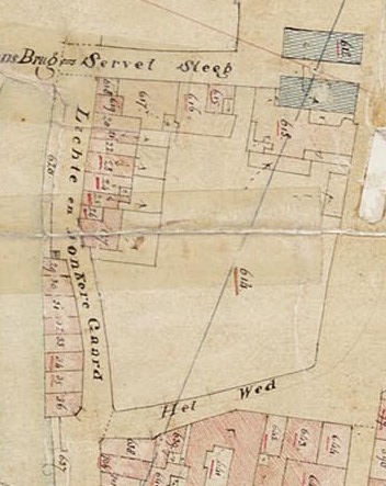 Deze erven hebben de volgende personen gehuurd: Het eerste aan de zuidkant voor 5 pond Gerit Ere (Donkere Gaard voorbij 13; tegenover Oudegracht 166 met onderdoorgang naar het Wed). Het tweede voor 22 schellingen Eelgis Gans (Donkere Gaard voorbij 13; tegenover het noordelijk deel van de straat het Wed). Het derde voor 18 pond Peter Wannevoet (Donkere Gaard 13). Het vierde voor 32 schellingen de erfgenamen van Hendrik Munters (Donkere Gaard 11 zuidelijk deel). Het vijfde voor 12 schellingen 9½ penning Peter Mouwerke (Donkere Gaard 11 noord). Het zesde voor de ene helft voor 6 schellingen 4½ penning Dirk geheten Vrenken; eveneens voor de andere helft voor 6 schellingen 4½ penning Jan Zoudelbalch en zijn vrouw Heilwig (Donkere Gaard 9-7). Het zevende voor 40 schellingen Matheus uten Graslande (Donkere Gaard 5) Het achtste voor 40 schellingen Peter Gardenaar (Donkere Gaard 3). Eveneens is daar alsnog een ander erf, dat het benedenste en negende van die erven is, waarover onze kerk geweld is aangedaan en waarop door geweld en tegen onze wil een huis is gebouwd. Wij hebben daarvan noch pacht noch rente, hoewel toch de grond van onze kerk is, welk erf Aart Amelisz. zich door geweld van de stad toegeëigend heeft (Donkere Gaard 1).’ In de oudste rekening, daterend van 1295/96, worden de posten opgesomd onder de paragraaf De areis supra fossatum (‘Van de huiserven aan de gracht’).[71a] De opsomming begint ook hier, na de vermelding van het Bocholts- of Boekhoutshuis, aan de zuidkant: ‘Van de