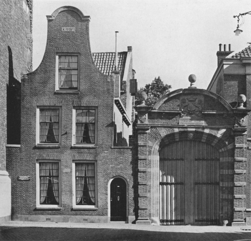 Van het Bocholtshuis 20 schellingen (Donkere Gaard 8?). Van het eerste erf Simon 25 schellingen (Donkere Gaard na 13 zuid). Van het tweede Gerit geheten Gans 20 schellingen (na 13 noord). Van het derde Jacob van der Maas 55 schellingen (13). Van het vierde Jacob Ouderman 20 schellingen (11 zuid). Van het vijfde Aart Ouderman 8 schellingen (11 noord). Van het zesde de voornoemde Jacob en Aart 8 schellingen (9-7) Van het zevende Trude 10 schellingen (5). Van het laatste Jan Spetharinc 10 schellingen (3).’ Ik behandel deze erven op deze plaats slechts voor zover ze informatie verstrekken over het bisschopshuis, en wel van noord naar zuid. Zeer informatief zijn in dit opzicht de gegevens betreffende het vijfde erf (Donkere Gaard 11 noordelijk deel). Opmerkelijk is dat dit het zuidelijk deel van het perceel wordt genoemd, terwijl het nu om het noordelijk deel van nummer 11 gaat. Uit de gegevens blijkt om te beginnen dat bij dit bovenste deel al in 1286 het huis van de bisschop als belending wordt opgegeven. In mei van dat jaar gaf het kapittel van Oudmunster ‘de bovenste helft van ons erf tussen het huis van de heer bisschop en Bruning’ aan Aart Ouderman voor 8 schellingen wettige Trechtse penningen per jaar.[72] Deze belendingen worden ook nog genoemd in een oorkonde van 3 juni 1345 waarin de domkanunnik Hugo Vustinc zijn zwager Peter Hugenz. Mouwerke dat recht gaf, met voorbehoud van het vierde deel dat huis en erf, dat aan Dirk Blauvoet toebehoorde.[73] Oudmunster gaf het goed op 14 oktober 1356 erfelijk uit aan Hildegond dochter van Eelgis Gans voor 18 schellingen en 8 penningen.[74] Donkere Gaard 13 – het tegenwoordige hoekhuis aan de zuidkant – levert ons ook een interessant gegeven op. In 1370 werd een geschil opgelost over een doorgang die de bisschop had in het noordelijk deel van de kelder van dit huis. Er is daar nog steeds een dubbele kelder met een noordelijk en een zuidelijk deel onder de straat aanwezig. De Gaardbrug met daarachter rechts van het hoekhuis aan de brug de bebouwing van de Donkere Gaard en daarboven, met de hoge schoorstenen, de westelijke bebouwing van het bisschopshof. Tekening van P.J. van Liender van omstreeks 1760. De Donkere Gaard omstreeks 1906 gezien vanuit het zuiden. Het hoekpand is Donkere Gaard 13, waarin zich nog steeds een deel van de doorgang naar het bisschopshuis bevindt. Voorbij nr. 13 bevonden zich – waar de werf smaller is – nog twee percelen, het meest zuidelijke tegenover Oudegracht 166. Onder het noordelijk deel van het zuidelijkste perceel liep het wed naar de gracht toe. Hier bevond zich in de elfde eeuw de zuidelijke burchtgracht. Het recht op deze ‘doorslag’ had al opgenomen moeten zijn in een oorkonde van 25 februari 1346, waarin het perceel uitgegeven was aan Peter Wannevoet en zijn vrouw Liesbet, maar dit was niet gebeurd. Misschien bestond de doorgang toen zelfs nog niet. Op 24 januari 1370 werd er alsnog een oorkonde met de datum 25 februari 1346 opgemaakt.[75] Daarin werd de clausule opgenomen: behoudelic onsen here den