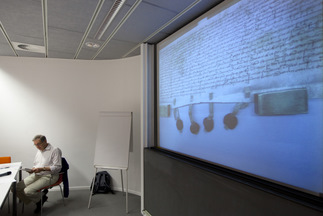 ![]() Martin de Bruijn aan het woord over de registratie van onroerend goed in de middeleeuwen. Copyright foto’s ‘Van schaap tot oorkonde’: Marc Bolsius, ’s-Hertogenbosch 1 oktober 2011, Stichting Brabantse Bronnen (www.donb.nl). |