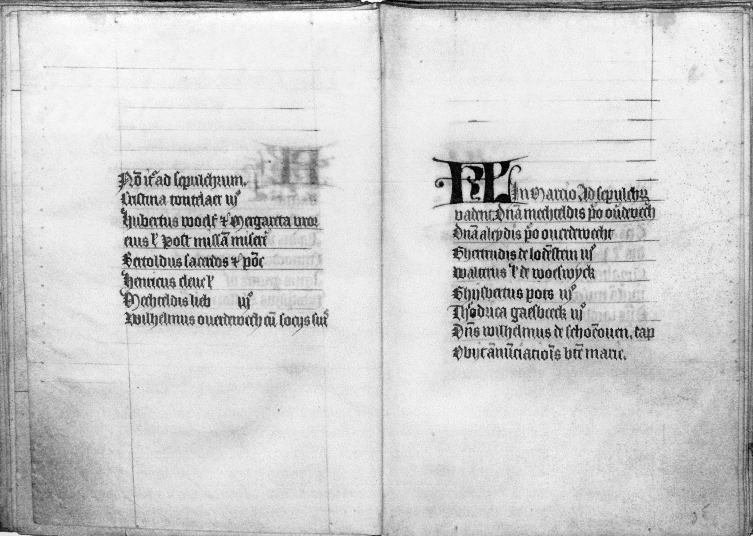 4 eius l[icet] post missa[m] micere[re]. 5 Bertoldus sacerdos l[icet] Po[n]s. 6 Henricus Cleve l[icet]. Hierbij valt om te beginnen op dat in deze transcriptie de eventuele achternaam van Bertoud niet weergegeven wordt als Ponc of Pont, maar als Po[n]s. Dat dit niet juist is, valt af te leiden uit de eind-s in het aan de onderzijde van de pagina weergegeven sociis. Vreemd is verder dat het teken tussen sacerdos en Po[n]s wordt getranscribeerd met l[icet], maar in de tekst over Lubertus Woelf en zijn vrouw met et. En het is inderdaad een gebruikelijk teken voor et en zeker niet voor licet. De auteurs van het artikel in Oud-Utrecht wisten het kennelijk ook niet. Ze lieten het daarom maar weg door puntjes te plaatsen: […]. Wij hadden op onze webpagina de post getranscribeerd als Bertoldus sacerdos et Ponc met een vraagteken erachter. Kortom, in de vermelding betreffende Hubertus (en niet Lubertus) Woelf en zijn vrouw is het teken zeer aannemelijk in de betekenis van et, maar niet in de vermelding van Bertoldus sacerdos. Nu komt op de betreffende pagina en blijkens de transcriptie van D'Oude School in het hele necrologium tamelijk veelvuldig een l voor met een apostrof als afkortingsteken. Zij transcriberen dit met licet en dat doen zij ook met het hiervan duidelijk afwijkende et-teken in de post betreffende Bertoldus. Dat is dus niet aannemelijk. Trouwens, de transcriptie licet voor het l+apostrofteken is dat evenzeer. Het meest waarschijnlijk lijkt het ons dat dit teken staat voor laicus, laica of laici. Alvorens onze eigen transciptie van de betreffende posten weer te geven, keren we nog even terug naar het et-teken. Dat lijkt ons hier en ook op andere plaatsen misplaatst. Zie bijvoorbeeld op het rechterblad de vermelding Walterus et de Woeswyck. Onafhankelijk kwamen Reinier van der Lof en wijzelf tot de conclusie dat hier waarschijnlijk het teken voor dictus had moeten staan. Dat resulteert in respectievelijk Bertoldus sacerdos dictus Ponc (eigenlijk Pont) en Walterus dictus de Woeswyck. Maar het is ook denkbaar dat er Walterus, laicus, de Woeswijk staat. In ieder geval staat op vele plaatsen in de transcriptie van D'Oude School licet waar nagenoeg zeker zou moeten worden getranscribeerd met dictus of laicus. Met verbetering van enkele andere transcriptiefouten van de onderzoekers van D’Oude School luiden de drie geciteerde posten dan vooralsnog: Hubertus