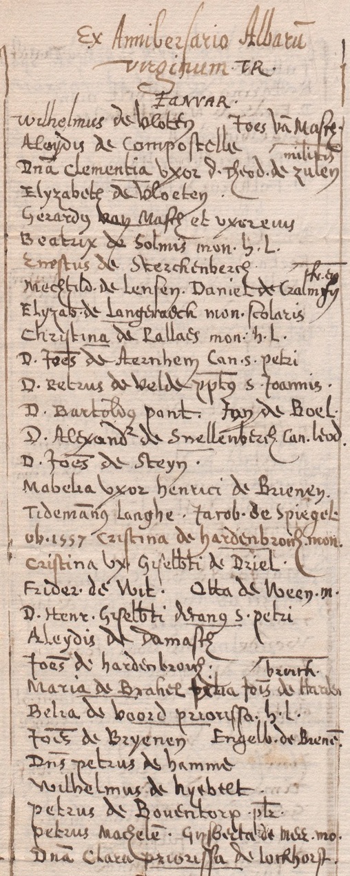 vermeldingen van Bertoud Pont![]() Van der Lof meent dat hier Pant staat, maar zoals op meerdere plaatsen blijkt, vormt de schrijver, de oudheidkundige Arnoud van Buchel, zowel de o als de a soms uit twee haaltjes en wanneer een van de haaltjes uitschiet, lijkt de letter o op een a en is dus ook de lezing Pont mogelijk.[9] De a’s daarentegen hebben doorgaans een langer rechter haaltje. De vermelding in de maand januari komt hier overeen met de sterfdatum van de vicaris van het grafsteentje, 12 januari 1397, in tegenstelling tot die in februari in het necrologium van Vrouwenklooster. Er lijkt dus alleszins van een identificatie sprake. En de t op het eind van de naam is hier niet te ontkennen. Deze worsteling met c’s en t’s en a’s en o’s mag misschien overdreven lijken, maar is in dit kader, waar het om de juistheid van de lezing van een naam gaat, alleszins van belang. Overigens is het bij de uitgave van historische bescheiden gebruikelijk om kennelijke fouten in de transcriptie te corrigeren en daarbij in een voetnoot aan te geven wat er in werkelijkheid in de getranscribeerde tekst staat. Gezien de op deze webpagina aangetroffen en beargumenteerde context zou dus in de transcriptie van zowel het grafsteentje als bovenstaande vermelding in het necrologium Pont dienen te staan met een voetnoot wat er werkelijk op het grafsteentje en in het handschrift staat en de aantekening dat er wél verdere gegevens over een familie Pont zijn, waarin ook de naam Bertoud voorkwam, maar niet over een familie en een Bertoud Ponc. Verdere aanvullende gegevens Nijver speurend kwam Van der Lof nog andere en specifiekere vermeldingen tegen, die hij met ons gedeeld heeft. Om te beginnen nieuwe gegevens over Bertoldus Pont of Bertoldus de Traiecto (van Utrecht) als kanunnik in Sint-Odiliënberg.[10] Zoals we gezien hebben, was steeds een Utrechtse domkanunnik proost van deze plaats bij Roermond. Hij kon er de kanunniken en andere geestelijken aanstellen. In 1356 werd de functie van proost van Sint-Odiliënberg uitgeoefend door de Utrechtse domkanunnik Nicolaas van Dordrecht en enkele jaren later, in 1361, door zijn collega Hugo Vustinc.[11] Uit de gegevens, die dateren van 1356 tot 1362, kan worden afgeleid dat Bertoud Pont er betrokken was bij de verhuizing van het kapittel naar Roermond.[12] Op 2 maart 1356 werden de kapittelstatuten gewijzigd en nader verklaard. De daarvan opgemaakte oorkonde werd uitgegeven door de kanunniken, van wie Bertoud van Utrecht (Bertoldus de Trajecto) als tweede werd genoemd, na Jan van Eindhoven (Johannes dictus de Endhoven) en vóór Rutger van Weert (Rutgherus dictus de Wert).[13] Op 8 juli van hetzelfde jaar werden de statuten goedgekeurd door proost Nicolaas van Dordrecht (Nicholaus de Dordraco).[14] Op 20 april 1361 gaven de Utrechtse bisschop en Hugo Vustinc, domkanunnik en proost van Sint-Odiliënberg, toestemming tot de verplaatsing van het kapittel naar Roermond.[15] Ruim een jaar later, op 23 augustus 1362 legden de kanunniken bij notariële akte een verklaring af over de rechten die zij vóór hun overbrenging bezaten. Bertoud Pont (Bertoldus Pont) werd nu als eerste onder zijn collega’s genoemd, opnieuw gevolgd door Rutger van Weert (Rutgerus de Weyrt). Bertoud Pont komen we in de periode vóór de verplaatsing van het kapittel ook nog tegen tussen Jan van Eindhoven en Rutger van Weert als kanunnik van Sint-Odiliënberg onder de naam Bertoldus de Trajecto op 22 juni 1356 en 10 februari 1357 bij de verkoop van goederen van het kapittel aan de landcommanderij Oudenbiezen van de johannieters.[16] Van het Luikse terug naar Utrecht? Zoals hierboven al is gezegd, hadden we al eerder ontdekt dat Bertoud Pont (Bartoldus Pont) op 22 oktober 1379 als eeuwig vicaris van de Utrechtse dom aanwezig was bij de eedaflegging van de nieuwe bisschop Florens van Wevelinghoven na de overplaatsing van Arnoud van Horn naar Luik.[17] In een oorkonde van ruim een jaar later blijkt hij rector te zijn geweest van het Sint-Catharina-altaar in de kerk van Borgloon, de hoofdstad van het middeleeuwse graafschap Loon, min of meer samenvallend met het huidige Belgisch Limburg. In dit stuk, daterend van 3 december 1380, moest de Luikse domkanunnik Hugo Vustinc namens Pont optreden voor de uitgifte in erfelijke pacht van een stuk grond.[18] Het is niet ondenkbaar dat Bertoud toen nog in Utrecht verbleef en zelfs mogelijk dat hij sindsdien zijn thuisstad niet meer heeft verlaten. Wat de Luikse kanunnik Hugo Vustinc betreft, er was ook een Hugo Vustinc domkanunnik in Utrecht. Dat het om dezelfde persoon ging, bleek Van der Lof uit de negentiende-eeuwse regestenlijst van het domkapittel van Luik. Op 16 februari 1393 vermaakte de Luikse domkanunnik Hugo Vustinc van Grotenhuys aan Gijsbrecht Vustinc, proost van Fosse, zijn claustraal huis in Luik en benoemde hem tot zijn universele erfgenaam.[19] Het feit dat ook de Utrechtse kanunnik een broer Gijsbrecht had, die hier kanunnik was van Sint-Jan,[20] maakt de identificatie hoogst aannemelijk. In ieder geval zal het om Utrechtse Vustincs zijn gegaan. Vooral dit laatste is hier van belang. We zien hier hoe de van Utrecht naar Luik overgeplaatste bisschoppen Jan van Arkel, in 1364, en Arnoud van Horn, in 1378, althans een deel van hun hofhouding meenamen en van ambten en waardigheden voorzagen.[21] Dit feit in aanmerking nemend is het zelfs denkbaar dat Bertoud Pont na het overlijden van bisschop Jan van Arkel in 1378 zijn toekomst als vicaris in de dom verder weer in zijn vaderstad Utrecht heeft gezien en niet in het Luikse bisdom. Conclusie Hiermee lijkt ons nogmaals en nader bevestigd dat het bij de naam op de Utrechtse grafsteen gaat om een domvicaris Bertoud Pont, die hoogstwaarschijnlijk identiek is met de Bertoldus Pont of Bertoldus de Traiecto die in de jaren vijftig en zestig van de veertiende eeuw kanunnik was in Sint-Odiliënberg/Roermond en omstreeks 1380 rector van het Sint-Catharina-altaar in de kerk van Borgloon in het vroegere graa