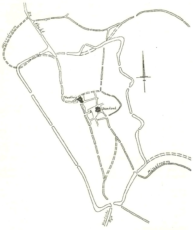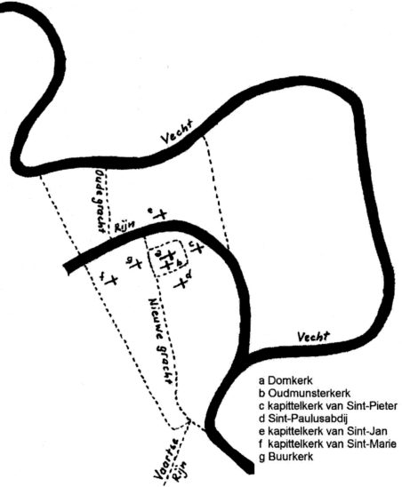 De echte oude gracht In een oorkonde uit 1127 wordt er in Utrecht gesproken van een novum fossatum, een nieuwe gracht.[17] Uit de context van de oorkonde die toen werd opgemaakt, blijkt dat hiermee het zuidelijk deel van de huidige Oudegracht werd bedoeld. Een nieuwe gracht veronderstelt ook het bestaan van een oude gracht. Tot voor kort werd nagenoeg algemeen aangenomen dat hiermee het noordelijk deel van de tegenwoordige Oudegracht werd bedoeld, en wel het deel tussen de bocht in de gracht bij het stadhuis tot aan de Weerdpoort bij het noordelijk deel van de stadsbuitengracht. Deze oude gracht zou gegraven zijn aan net eind van de tiende of het begin van de elfde eeuw om een verbinding tot stand te brengen tussen de Rijn in het zuiden en de Vecht in het noorden.[18] Van Dinter c.s. zijn evenwel van mening dat er al in de Romeinse Tijd een splitsing tussen de Rijn en de Vecht heeft bestaan ten noordwesten van het Romeinse castellum, dat zoals bekend gelegen was rond het tegenwoordige Domplein. Aanvankelijk zou de afsplitsing bestaan hebben uit een rivier die ongeveer recht naar het noordwesten en vervolgens naar het noorden stroomde, maar later zou zij gaan meanderen. Op de in de Appendix geplaatste plattegrond van circa 800-100 (afb. A6-4) zou deze rivier de Vecht eerst vanaf de bocht van de huidige Oudegracht in noordoostelijke richting gestroomd hebben en daarbij ongeveer het tracé vanaf de Neude door de Voorstraat gevolgd hebben. Bij het Begijnehof zou zij vervolgens niet meer het tracé van de naar het oosten buigende Voorstraat hebben gemaakt, maar een bocht in noordelijke en vervolgens in westelijke richting, om daarna uit te komen in het deel van de Vecht waaraan – voor zover ik heb kunnen nagaan algemeen aangenomen – de bij de opgravingen aan de Waterstraat/Jan Meijenstraat teruggevonden haven lag.[19] Volgens de afbeelding zou er pas later een gracht vanaf de genoemde bocht bij de Stadhuisbrug naar de eventueel latere Weerdpoort gegraven zijn. Deze laatste gracht werd tot nu toe vrijwel algemeen beschouwd als de echte Oudegracht tegenover het zuidelijk deel van deze gracht dat in 1127 aangeduid werd als de novum fossatum, de nieuwe gracht dus. Maar daarover later meer. Men had mogen verwachten dat Van Dinter c.s. hun nogal onaannemelijk lijkende aanname van deze ‘nieuwe’ rivier nader onderbouwd en beargumenteerd zouden hebben, maar dit is geenszins het geval. Men vindt slechts op p. 36 van de Appendix: ‘In the south of the city, three