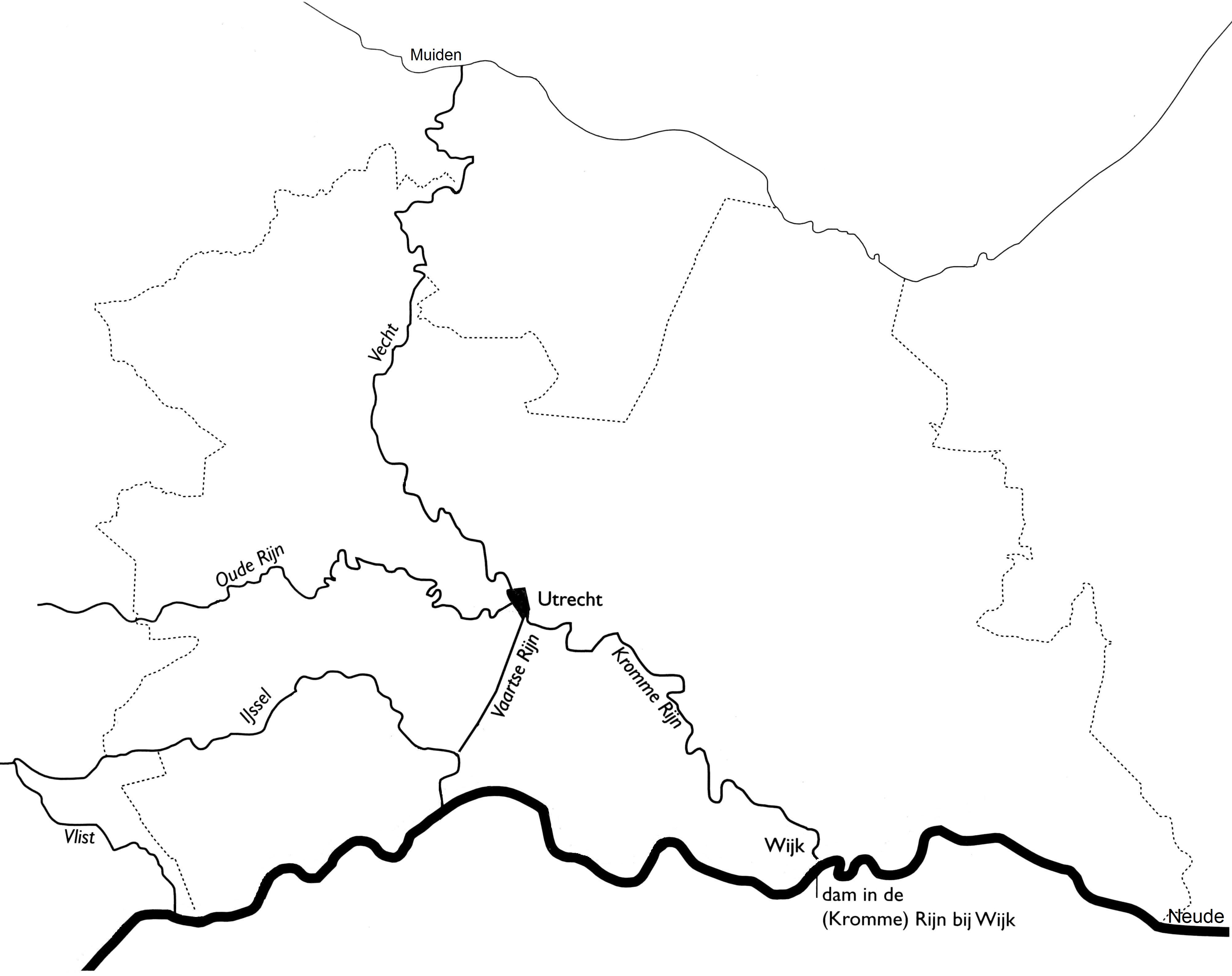 Ook Van Dinter c.s. nemen blijkens hun afbeelding in de Appendix (afb. A6-4) wel een gegraven gracht aan, maar die moet dan van latere tijd zijn dan de door hen veronderstelde rivierarm. Zij laten zich er niet over uit of deze gracht de echte ‘oude gracht’ was, maar wanneer dit ook voor hun wel het geval was, moet zij dus ouder zijn geweest dan 1127. Ik denk dat de rivierarm door het noordelijk stadsgebied mede ingegeven is door het zojuist genoemde artikeltje van de Utrechtse mediëviste J.M. van Winter. In dit artikel toont de schrijfster zich onder meer ook een kritiekloze aanhangster van de theorie van de Utrechtse archeoloog C.A.M. van Rooijen dat de zogeheten vicus Stathe niet, zoals altijd is aangenomen, ten westen van de Utrechtse burcht lag – in de omgeving van de Buurkerk –, maar langs de rivier de Vecht in het noorden van het latere stadsgebied. Het betreffende artikel van Van Rooijen is in het Engels verschenen in het archeologisch tijdschrift Medieval and Modern Matters[23] en in het Nederlands in het Jaarboek Oud-Utrecht 2010[24] (zie ► De vicus Stathe). Van Winter vermeldt niet dat op de Engelstalige versie een uitvoerige afwijzende kritiek is geleverd door de voormalige stadsarcheoloog van Utrecht T.J. Hoekstra.[25] Deze concentreert zich hierin hoofdzakelijk, zij het niet alleen, op de archeologische gegevens. Van Winter verwijst evenmin naar mijn eigen uitvoerige beschouwingen over deze hypothese op de zojuist genoemde webpagina, hoewel die haar bekend moeten zijn geweest. Het behoort tot haar ‘methode’ om onwelgevallige bronnen en argumentatie weg te laten (zie hiervoor behalve de hiervóór gemaakte kanttekening bijvoorbeeld ► Een kamertje als kathedraal?) en daartegenover zeer stellige uitspraken zonder enige nuancering te doen om haar hypotheses kracht bij te zetten. Dit is ook hier weer het geval, zoals uit het volgende zal blijken. De Neude Van Winter is verder namelijk van mening dat de Noda die genoemd wordt in een oorkonde uit 1165 de Utrechtse Neude en niet de Neude tussen Rhenen en Wageningen is, zoals nagenoeg algemeen wordt aangenomen.[26] In deze oorkonde lost keizer Frederik Barbarossa in verband met de wateroverlast een aantal waterstaatkundige problemen in het Nederlandse rivierengebied op. Dat met de Neude die in de stad Utrecht werd bedoeld, is op zich niet onmogelijk, maar wel heel erg onwaarschijnlijk. In 1165 was de Kromme Rijn al meer dan veertig jaar afgedamd en de stad Utrecht al net zo lang omwald. Een dergelijke doorbraak had voor de afvoer van het water, in welke richting dan ook, geen enkele betekenis meer. De betreffende bepaling uit 1165 zal dan ook niet te maken hebben gehad met wateroverlast veroorzaakt door de Oude Rijn, maar wel door de rivier de Lek, die vanaf de afdamming van de Rijn bij Wijk bij Duurstede omstreeks 1122 aanmerkelijk meer water was gaan ontvangen. Waarschijnlijk was dit hierdoor ook verder stroomafwaarts met de Hollandse IJssel het geval. Dat het in 1165 om de Neude tussen Rhenen en Wageningen ging en niet om de Utrechtse Neude, blijkt ook uit de volgorde, waarin in de oorkonde – waarschijnlijk november van dat jaar, toen de keizer in Utrecht was – de waterstaatkundige problemen werden afgehandeld, namelijk met de stroom van de rivieren mee: dus eerst de voorgenomen doorbraak van de Rijn bij de Neude bij Wageningen, vervolgens de dam in de Rijn bij Wijk en tot slot de dam in de Oude Rijn bij Zwadenburg (de Zwammerdam). Wat tot slot tegen de Neude in Utrecht pleit: terwijl de Rhenense Neude vanaf de twaalfde eeuw regelmatig in de oorkonden vermeld wordt – daar werd ook de zuidoostgrens van het Nedersticht gesitueerd –,[27] komt de Neude in de stad Utrecht pas vanaf de veertiende eeuw in de bronnen voor. In de tweede helft van de vijftiende eeuw werd zij opgehoogd.[28] Het is niet ondenkbaar dat de Utrechtse Neude haar naam ontleend heeft aan de moerassige Neude tussen Rhenen en Wageningen. De gracht voor de afvoer van een deel van het Rijnwater door de Neude bij Rhenen naar de Eem toe is er echter vooralsnog niet gekomen: de bewoners langs de Lek en de Hollandse IJssel behielpen zich verder met de aanleg van dijken. Hierdoor werd de doorgraving tussen Rhenen en Wageningen van minder belang. De Hollandse IJssel is in 1285 door de Hollandse graaf afgedamd bij Hoppenesse ten zuiden van IJsselstein, wat de scheepvaart bemoeilijkte, maar de kans om het hele jaar door droge voeten te houden langs de Hollandse IJssel aanmerkelijk heeft vergroot.[29] Dat het hoogstwaarschijnlijk is dat de verbinding tussen de Rijn en de Vecht in Utrecht – de oorspronkelijke Oudegracht – aan het eind van de tiende eeuw gegraven is, kan tot slot ook worden afgeleid uit de vaststelling van Van Dinter c.s. dat de Vecht vanaf die tijd meer water uit de Kromme Rijn ontving en dat daar tegenover de Oude Rijn, dus de rivier voorbij Utrecht, vanaf die tijd begon dicht te slibben: ‘By the end of the 10th