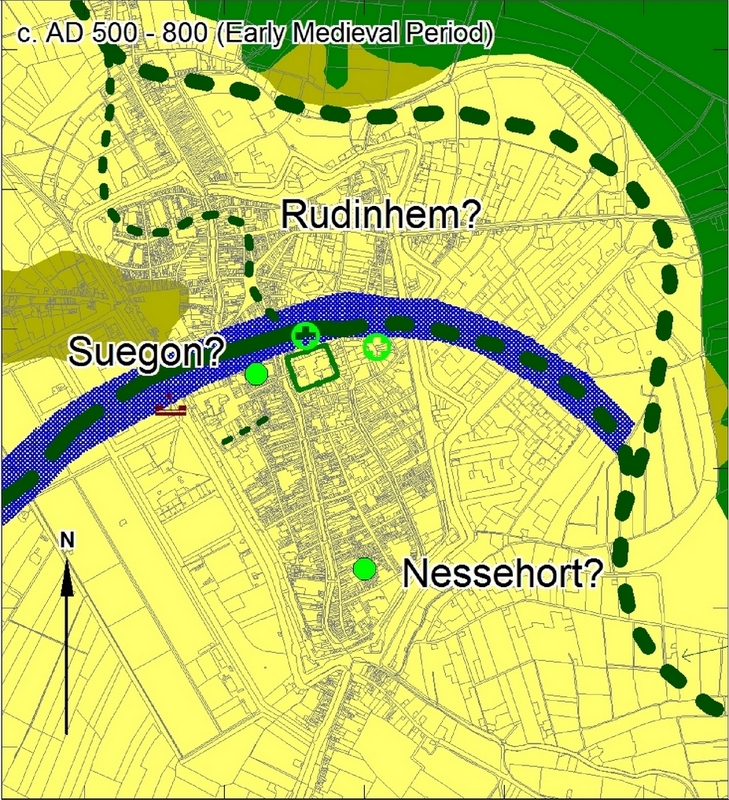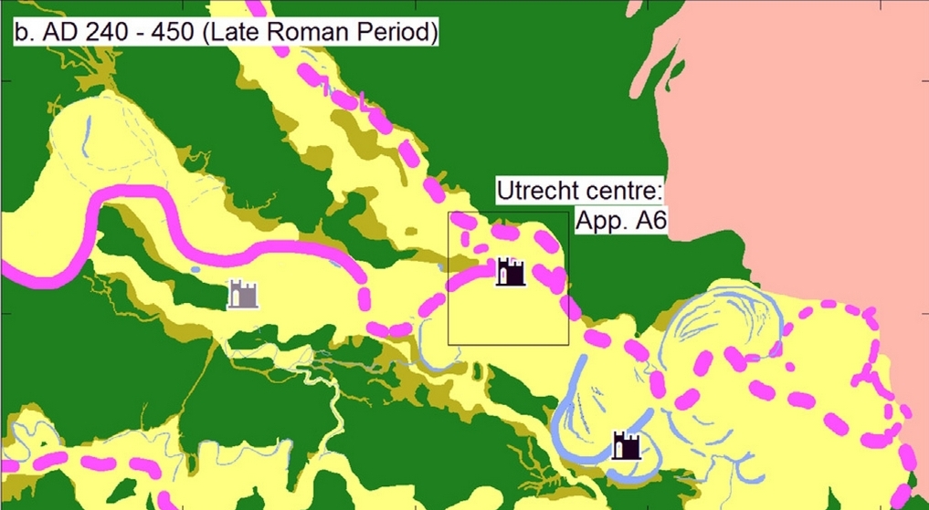 Helaas is ook dit artikel, in een tijdschrift uitgegeven door Elsevier, weer alleen tegen zeer hoge kosten te verkrijgen (zie de kanttekeningen over de onwenselijkheid hiervan in ► Op en rond het Domplein). De auteurs, wier bijdragen aan het artikel niet gespecificeerd worden, baseren zich op zowel geologische en archeologische als historische bronnen. Dit had vanzelfsprekend op een geïntegreerde manier gedetailleerd dienen te gebeuren, maar zoals uit het vervolg zal blijken, is dit niet het geval. Hoe indrukwekkend de opsomming – ik gebruik met opzet het woord opsomming – van geologische en archeologische gegevens ook mag zijn (in tegenstelling tot de historische), deze gegevens zijn in de meeste gevallen niet aantoonbaar geïntegreerd behandeld. De publicatie is zowel door de gebruikte taal, het Engels, en het taalgebruik vol vaktermen, als de behandeling van de stof zo toegankelijk als een nagenoeg onbegaanbaar moeras. Als voorbeeld – voor deze eerste reactie – heb ik de publicatie nagezien op een van de kernproblemen van de ontwikkeling van de rivieren rond Utrecht: de plaatsen van de splitsing van de Rijn en de Vecht. Voor zover ik weet wordt algemeen aangenomen dat het Romeinse castellum zijn ontstaan te danken heeft aan zijn ligging in de nabijheid van deze splitsing. De onopgeloste vraag was echter waar deze splitsing zich bevonden heeft. Laten we beginnen met de door Van Dinter e.a. aangenomen loop van de Rijn. Deze wordt zowel in de Romeinse Tijd als de Vroege Middeleeuwen weergegeven als een bocht vanuit het zuidoosten naar het westen en vervolgens zuidwesten toe. Het castellum lag in de oksel van deze bocht, voor zover van een oksel gesproken kan worden (zie de ook hier weergegeven afbeeldingen A6 van de bijlage). De aansluiting met de Rijn ten oosten van de stad wordt alleen in onderbroken lijnen aangegeven en is volgens de auteurs in de loop van de eeuwen aan grote veranderingen onderhevig geweest (zie de hier eveneens afgedrukte afbeeldingen 8 van het artikel). De auteurs nemen aan – en dat is nieuw in de discussie – dat er in de Romeinse tijd een splitsing heeft bestaan van de Rijn en de Vecht onmiddellijk ten noorden van het castellum. Zij construeren die voor de periode tussen ongeveer 40 en 240 na Christus in een gebroken lijn in noordwestelijke richting. Vanaf 240 zou deze rivierarm vervangen zijn door een rivierarm in noordelijke richting, die met een bocht eerst naar het westen en vervolgens weer naar het noorden toe uitkomt in een andere rivier, waarin we de Vecht uit later tijd herkennen. Ook deze laatste rivierloop lijkt een afsplitsing te zijn geweest van de Rijn. Overigens wordt een en ander aangegeven met onderbroken lijnen. Wie op zoek gaat naar een onderbouwing krijgt het volgende voorgeschoteld (bijlage p. 39): ‘In the Early and Middle Roman