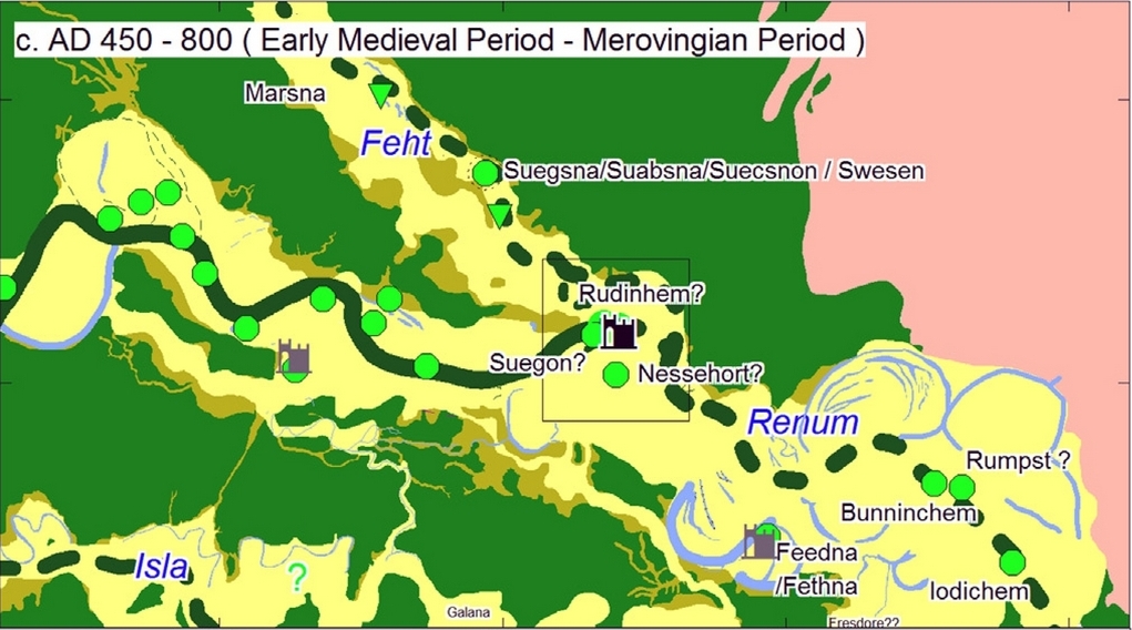 Afbeelding 6 van de bijlage bij het artikel (p. 43) geeft vier overzichten van de rivieren in en rond het stadsgebied (zie de afbeeldingen hieronder). De Vecht en de geconstrueerde splitsing ten noorden van de Utrechtse burcht worden in onderbroken lijnen weergegeven. Verder kan uit deze afbeeldingen worden afgeleid dat er in de periode tussen 800 en 1200 grote wijzigingen in de loop van de rivieren zouden hebben plaatsgehad. Omdat er een situatie gesuggereeerd wordt, terwijl er in werkelijkheid sprake is geweest van ingrijpende ontwikkelingen gedurende een periode van vier eeuwen, spreekt het voor zich dat hier nog zeer veel nadere uitwerking door middel van bronaanduiding en op de bronnen gebaseerde argumentatie noodzakelijk is. Deze ontbreekt nagenoeg in zowel het artikel als in de bijlage. |