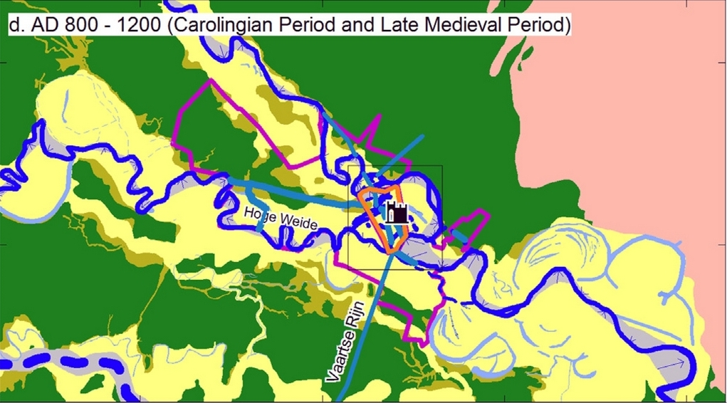 beschouwing. Ik wil daar op een ander tijdstip nog wel eens op ingaan. Er wordt dus opgemerkt dat het castellum net als andere Romeinse forten waarschijnlijk werd gesitueerd aan een knooppunt. Dit zou betekenen dat het verder naar het zuidoosten toe gelegen oudere fort Vechten, hoogstwaarschijnlijk naar de Vecht genoemd, enkele kilometers stroomopwaarts van dat knooppunt heeft gelegen. Maar er kunnen volgens de auteurs in de Midden-Romeinse Tijd ook twee knooppunten geweest zijn: een ouder geërfd van het Angstel-systeem – dus ten noorden van het latere stadsgebied – en een jonger dat zich verder ontwikkelde tot het Vecht-systeem. Behalve het slotenpatroon zouden archeologische vondsten uit de Romeinse Tijd in een reststroomgordel #129A (de Vecht dus) wijzen op een verlanding in de Romeinse Tijd (verplaatsing, moerasvorming of afsnijding van de rivierbocht). De tweede tak zou verder naar het oosten kunnen hebben gelegen, vormde een ongeveer 250 m brede geul en vertoont een restgeul die verstopte gedurende de derde tot de vroege vijfde eeuw. Opmerkelijk is dat er niets gezegd wordt over de manier waarop de Rijn vanuit het oosten de burcht naderde. Alleen uit de plattegronden valt af te leiden dat Van Dinter c.s. voor de Romeinse Tijd en de Vroege Middeleeuwen uitgaan van een tamelijk rechte rivier, die ten oosten van Utrecht pas in de Hoge Middeleeuwen is gaan meanderen (en om dit laatste niet ten onrechte ook hier nog steeds de Kromme Rijn werd genoemd). Voor de oudere periode blijkt alles wat over de splitsing van de Rijn en de Vecht wordt gezegd allemaal vaag en vermoedelijk te zijn; in het korte citaat achtereenvolgens ‘most likely’, ‘likely’, ‘would mean’, ‘would be’, ‘cannot be excluded’, ‘would continue’, ‘supports to assign’, ‘might have been’. Met andere woorden: het zou volgens de auteurs ook allemaal anders kunnen zijn geweest. Of nog weer met andere woorden: hier hebben we nauwelijks iets aan als het er om gaat de plaatsen van de splitsing van de Rijn en de Vecht gedurende de eeuwen aan te wijzen. De geïnteresseerden blijven dus met een hoogst onvoldaan gevoel achter, dat nog wordt versterkt door de ontoegankelijke manier van bronvermelding en het nagenoeg ontbreken van argumentatie. Maar ook over de situatie – veel meer dan over de ontwikkeling – in de Hoge en Late Middeleeuwen laten Van Dinter c.s. hun licht schijnen: ‘The mapping of the Vecht channel