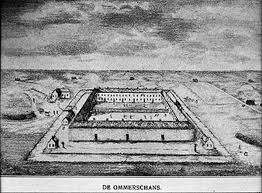 ![]() Vogelvluchtafbeelding van de Ommerschans als bedelaarskolonie. [1] De oprichting had al plaats in 1819. |