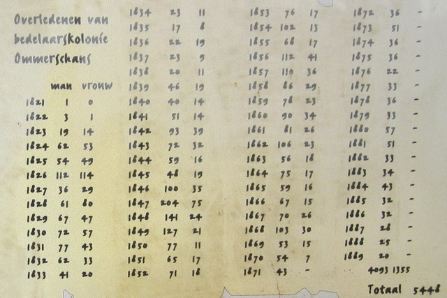 Overzicht van de overledenen in de Ommerschans: van 1821 tot 1889 in totaal 5448 personen. 1847, toen mijn oudvader Pieter Wijting er overleed, was het ‘topjaar’: toen stierven er maar liefst 204 mannen en 75 vrouwen. Zoals ik uit het overlijdensregister van dat jaar heb kunnen aflezen, waren hieronder ook veel kinderen. [6] Waarschijnlijk ten gevolge van de syfilis of juist de behandeling tegen die geslachtsziekte met kwik. [7]